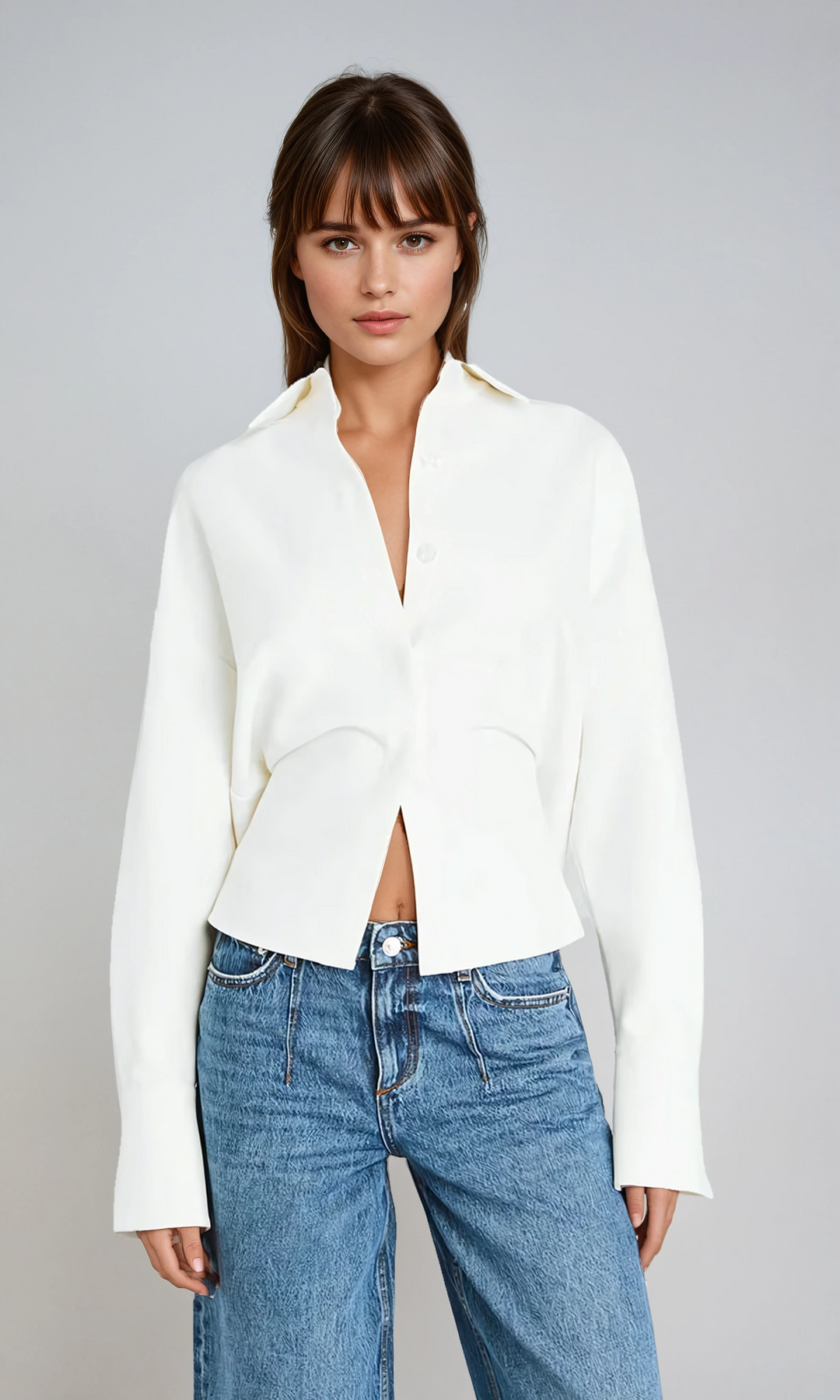 Tailored meets fluid in this softly structured button-down shirt. Designed with an elegant drape and sculpted underbust seams, this piece flatters the silhouette while maintaining a clean and minimalist look. A day-to-night staple that elevates both denim and dress trousers.